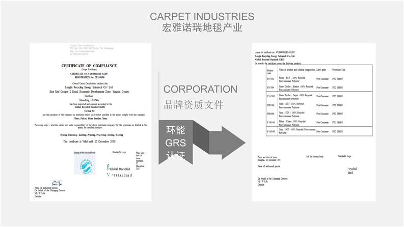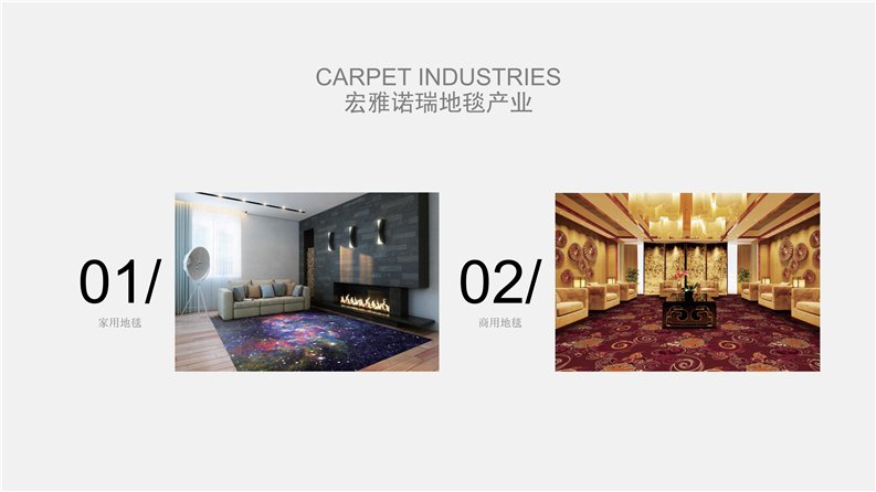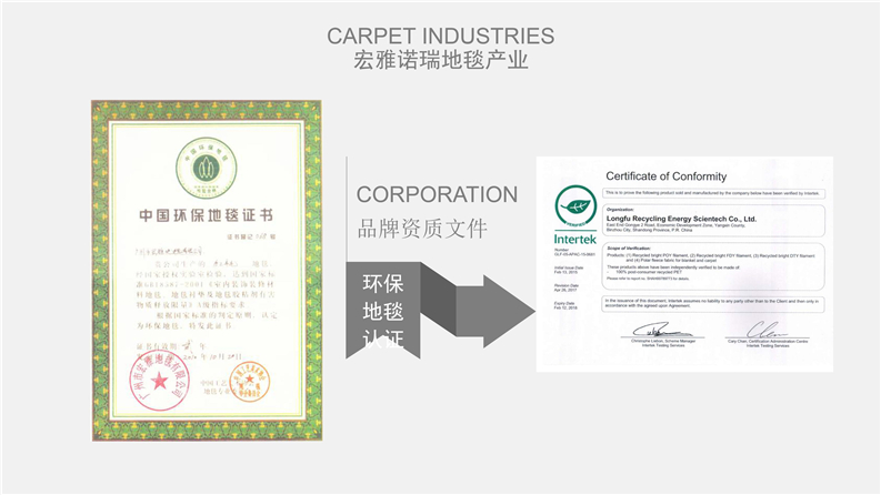 2012年,宏雅諾瑞地毯品牌為更好的適應市場日益快速發展的需求,戰略性合作各地化纖生產集團共同研發大型商用地毯產品,志在全面性做好品牌在全球的市場營銷戰略,聯合工廠占地面積60萬平方米以上、員工6000余人、中高級技術人員300余人,規劃以資源循環高效利用為主發展的高科技企業,擁有羊毛、特種環保纖維、尼龍長絲及特種V紗地毯原料生產的多套生產線,是國內唯一擁有綠色環保資源循環全套產業鏈的大型企業。
