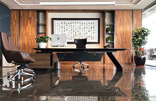 本案擁有辦公家具,休息區,辦公區,貴賓區等功能分區,整體采用多彩的暖色為主色調,勾勒出端莊與時尚的線條美。家具陳設講究對稱,重視文化意蘊;配飾擅用字畫,古玩、卷軸,精致的工藝品加以點綴更顯主人的品味與尊貴,更具有文化韻味和獨特風格。